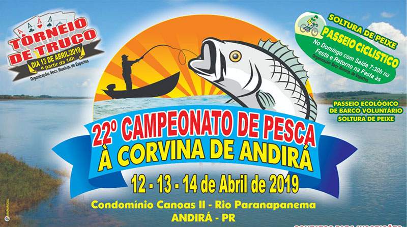 O 22º Campeonato de Pesca à Corvina de Andirá começa na próxima sexta-feira (12). Parte integrante do calendário turístico do Paraná, o Campeonato deve atrair pessoas de toda região norte do Paraná, sul do estado de São Paulo e de diversas partes do Brasil.