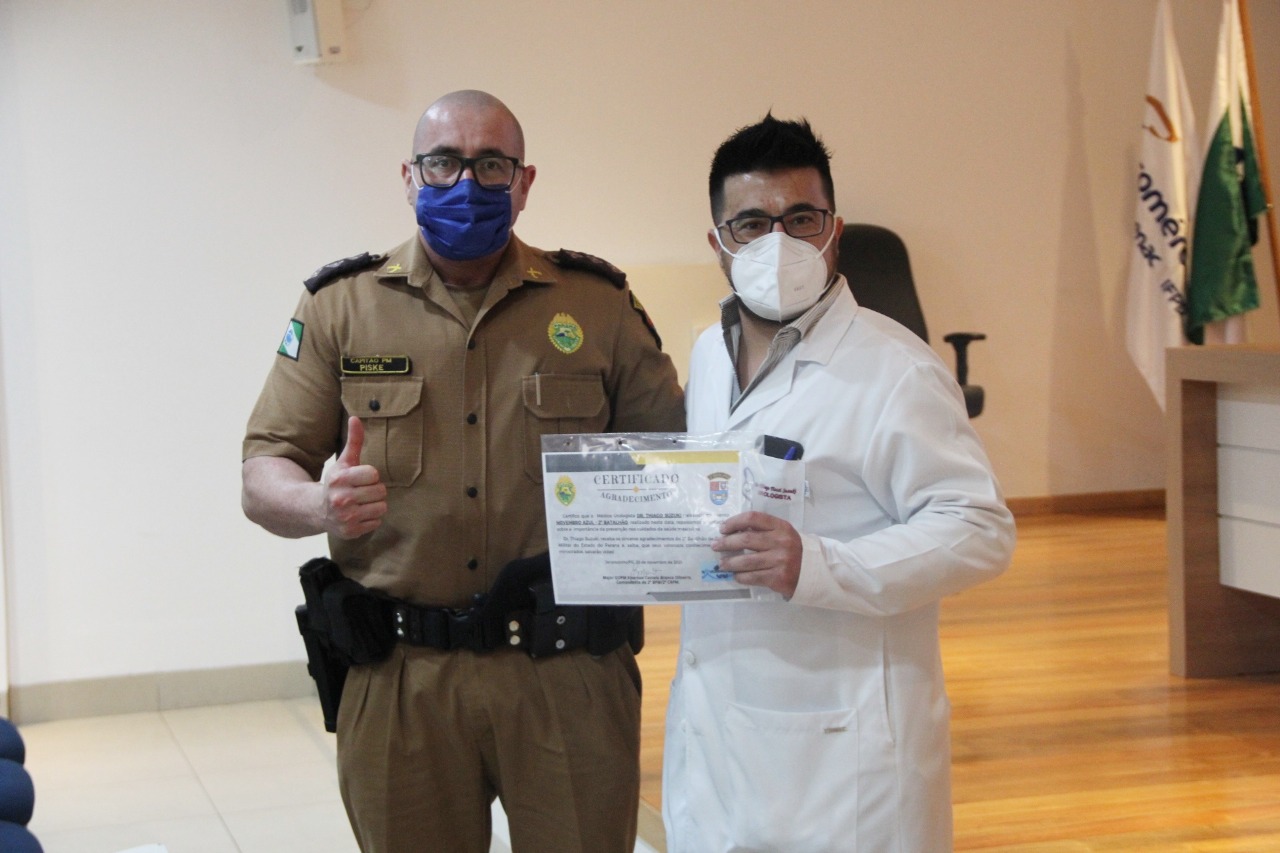 Ao final, o Capitão Piske realizou a entrega do certificado de gratidão aos palestrantes, os quais, gentilmente e de forma gratuita, cederam seu tempo e compartilharam seus conhecimentos aos integrantes da Corporação.