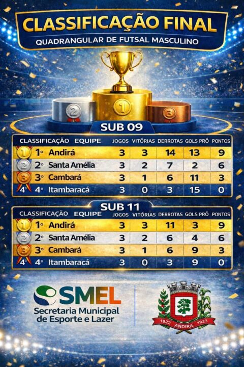 No último dia 8 de março, o Ginásio de Esportes Morcegão de Andirá foi palco da realização do Quadrangular de Futsal Masculino nas categorias Sub-09 e Sub-11. O evento, organizado pela Secretaria Municipal de Esportes e Lazer, com os professores Reinaldo Fernando e Aline Jussiani, reuniu jovens atletas mirins de Andirá e cidades vizinhas.
