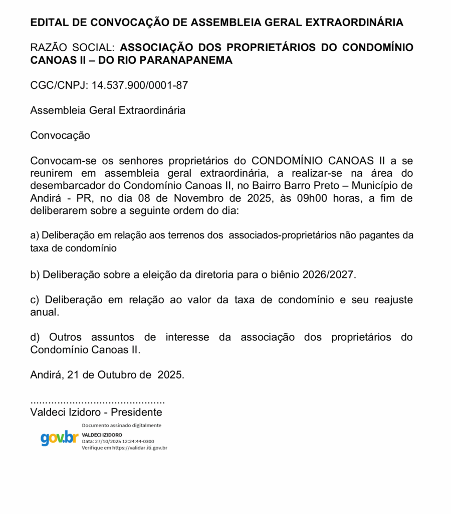 Convocam-se os senhores proprietários do CONDOMÍNIO CANOAS II a se reunirem em assembleia geral extraordinária, a realizar-se na área do desembarcador do Condomínio Canoas II, no Bairro Barro Preto – Município de Andirá – PR, no dia 08 de Novembro de 2025, às 09h00 horas, a fim de deliberarem sobre a seguinte ordem do dia: