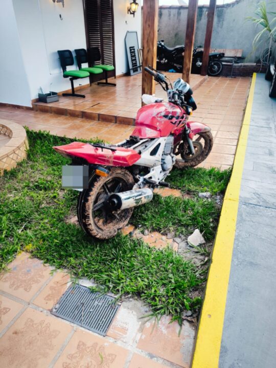 Ao chegar ao endereço, os policiais realizaram consulta via sistema intranet da placa AKK-7247, que apontou para uma Honda CBX 250 Twister de cor azul, divergindo do modelo encontrado. Durante a verificação do número do motor, constatou-se que o veículo se tratava, na verdade, de uma Honda CBX 250 Twister de cor vermelha, com emplacamento original DWX-9673, ano/modelo 2007/2008.