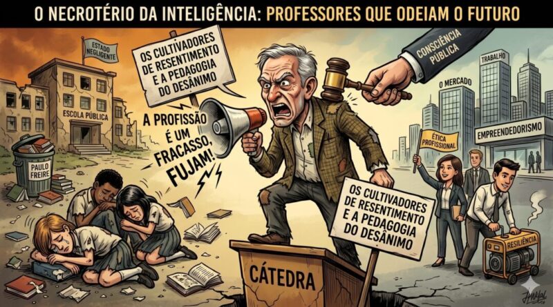 A educação brasileira não está em crise; ela está em estado de putrefação. O que vemos hoje nas salas de aula, desde o chão da escola pública até os corredores das universidades de elite — que hoje não passam de centros de ressonância do fracasso da base —, é um espetáculo de horrores morais. O maior inimigo do aluno não é mais apenas o Estado negligente ou a família ausente; é o professor que se tornou um mercador do desânimo, um profeta do “não vale a pena”.