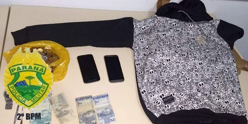 Em busca pessoal no mesmo, foi encontrado em seus bolsos dois celulares, sendo um Moto G preto, um celular prata HTC, R$ 104,00 (cento e quatro reais), uma nota de cinco euros, R$ 94,15; um relógio de pulso, que relatou ter furtado tudo na cidade de Jacarezinho na data de ontem, inclusive a blusa que o mesmo havia dispensado. Também foi encontrado com o mesmo, duas chaves mixa utilizadas para abrir portas. O abordado relatou que o dinheiro era advindo do furto realizado a uma localidade denominada “pague fácil” em Jacarezinho, registrado no boletim 2019/668138.