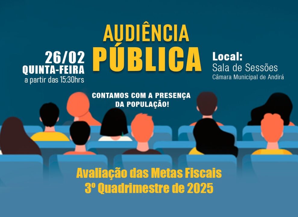 A Prefeitura de Andirá realiza nesta quinta-feira, 26 de fevereiro de 2026, às 15h30, uma audiência pública para a Avaliação das Metas Fiscais do 3º Quadrimestre de 2025. O encontro será realizado na Câmara Municipal de Andirá e é aberto à participação de toda a comunidade.