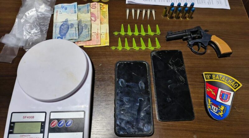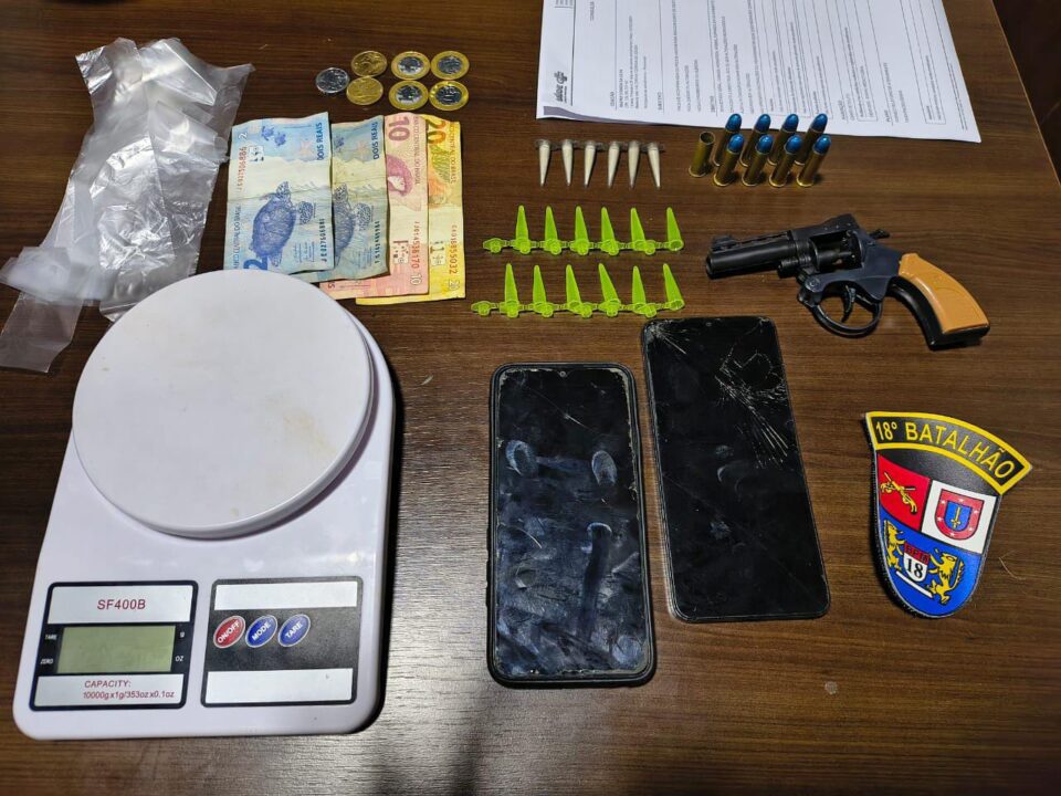 Durante patrulhamento na noite de sábado, na Rua Jorge Pedro Batista, a PM flagrou a entrega de um objeto entre dois indivíduos em frente a uma residência já apontada como ponto de tráfico. Ambos tentaram fugir, sendo que um deles foi contido com seis eppendorfs de cocaína. O morador conseguiu escapar, dispensando uma sacola contendo um simulacro de revólver, nove munições calibre .38 (uma deflagrada), R$ 38,00 em dinheiro e outros objetos relacionados ao tráfico. No interior da residência estava a namorada do suspeito, uma adolescente, que confirmou a prática criminosa.