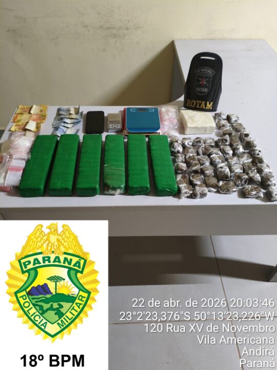 Uma ação da equipe ROTAM do 18º Batalhão de Polícia Militar resultou na prisão de um homem por tráfico de drogas, além da apreensão de grande quantidade de entorpecentes e materiais utilizados para o comércio ilícito, no município de Andirá.